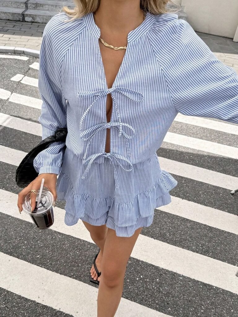 A blue striped A-line dress finished with front bow details and a ruffled hem. A relaxed option for daytime outings.