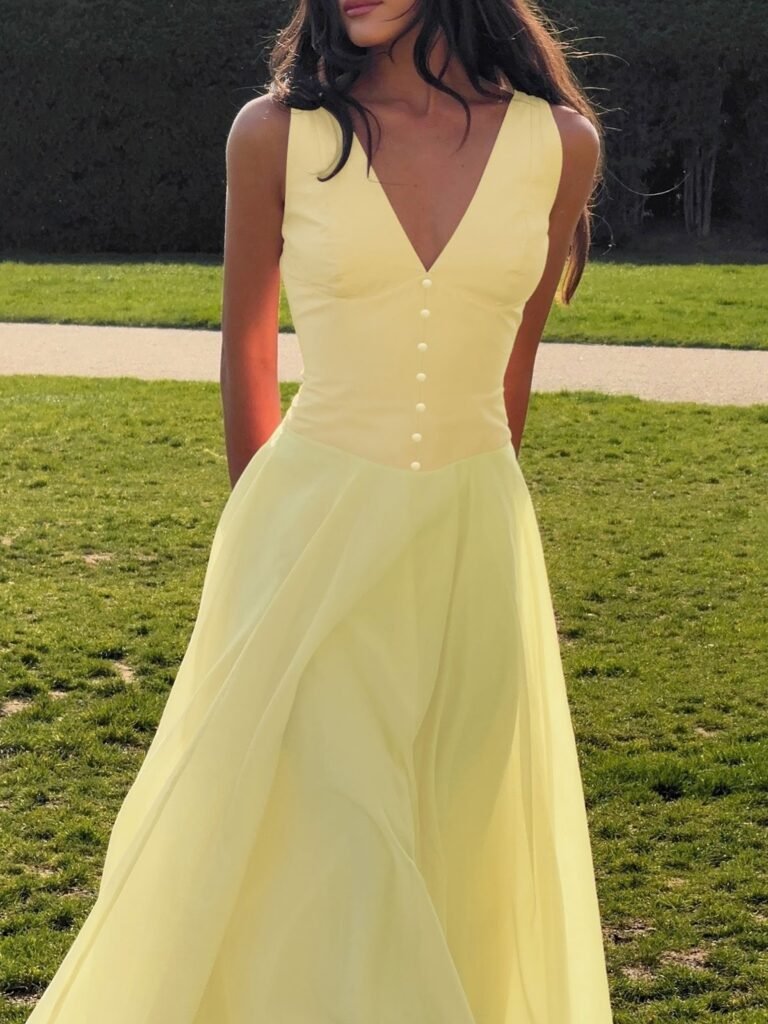A pastel yellow dress with a V-neckline and button detailing. The soft silhouette makes it an easy pick for outdoor lunches or daytime gatherings.